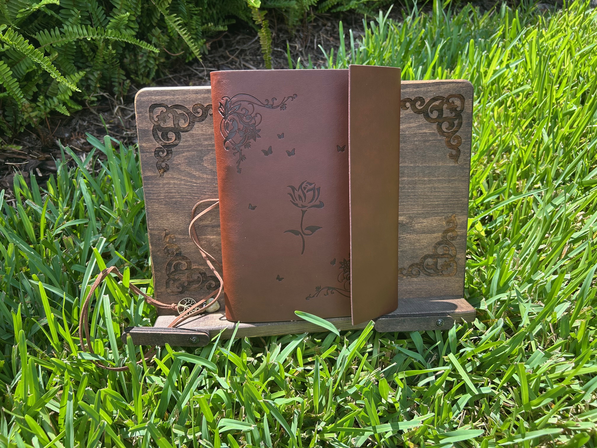 * Refillable Leather Cover – Soft brown leather, embossed with floral and butterfly details, wraps around your grimoire to keep your workings safe.